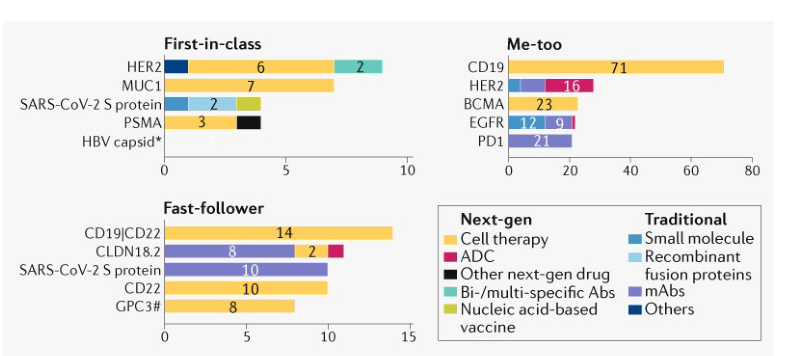 图2. first-in-class , fast-follower和me-too药物的前五大靶标