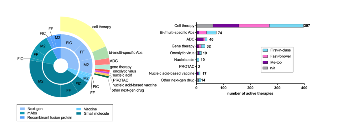 与2020年相比,正在开发的抗癌药物的数量已从787种增加到1,283种,增长主要包括肿瘤免疫 (IO)药物(281)和靶向药物(180) (图4)。在不同类别的IO药物中,细胞疗法的增幅最大,有144种新的活性药物进入管线,其次是T细胞靶向免疫调节剂。与总体first-in-class药物管线一致,细胞疗法和双特异性或多特异性抗体主导了肿瘤first-in-class药物管线(图4)。
