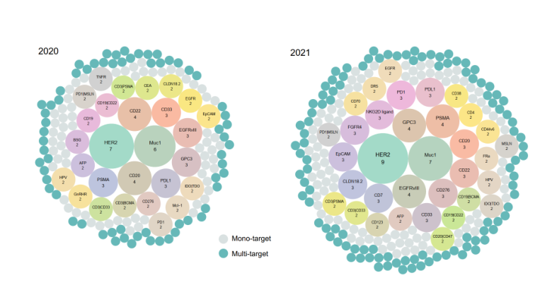 此外,2021年的靶标范围更加多样化,其中近一半是多靶标组合(图6)。