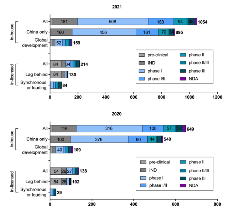 图7.进展阶段最高的肿瘤药物国内外发展概况(2021年vs 2020年)